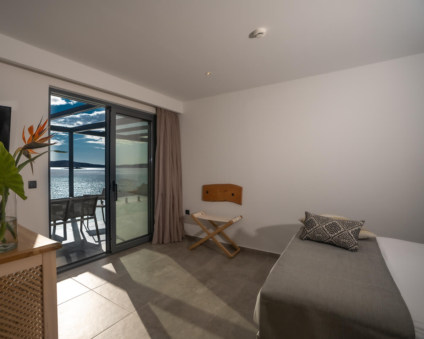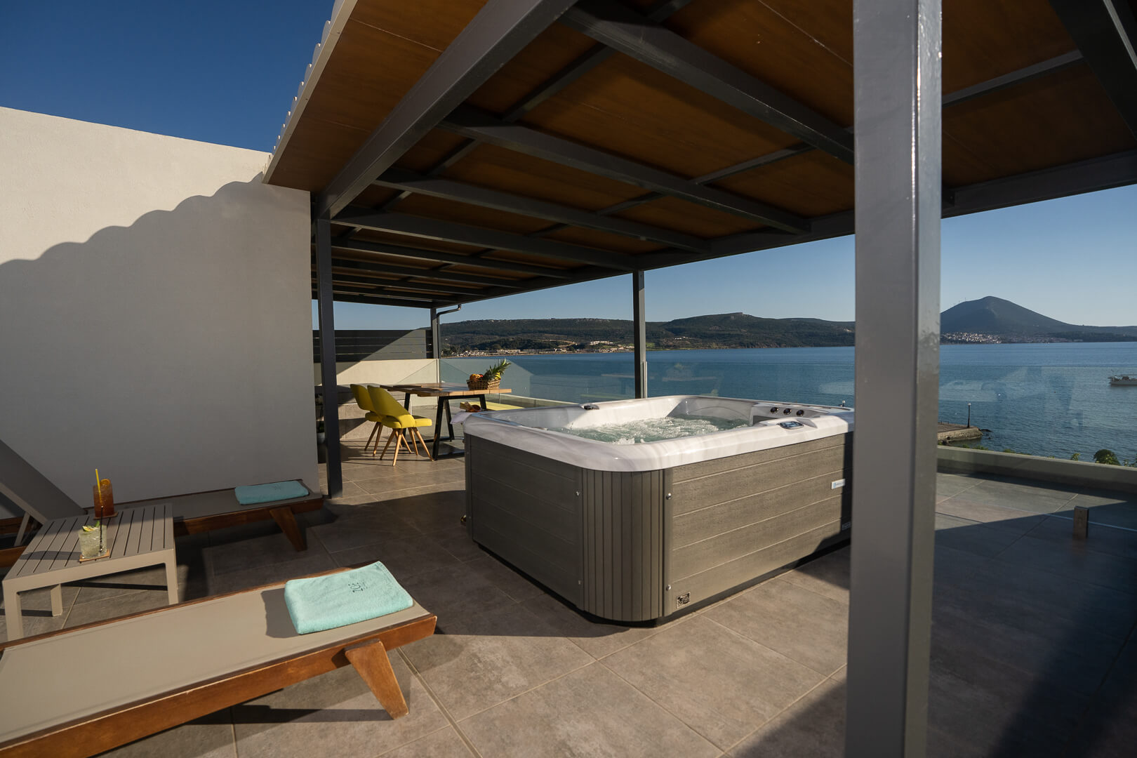 Mit modernem Schlafzimmer, einem Badezimmer mit ebenerdiger Dusche und einer großen Terrasse mit Tagesbett, privater Jacuzzi Sitzbereich Sonnenliegen, und Esszimmer wo Sie private speisen konnen mit Panoramablick und endlosem Meerblick auf die Bucht von Navarino.
