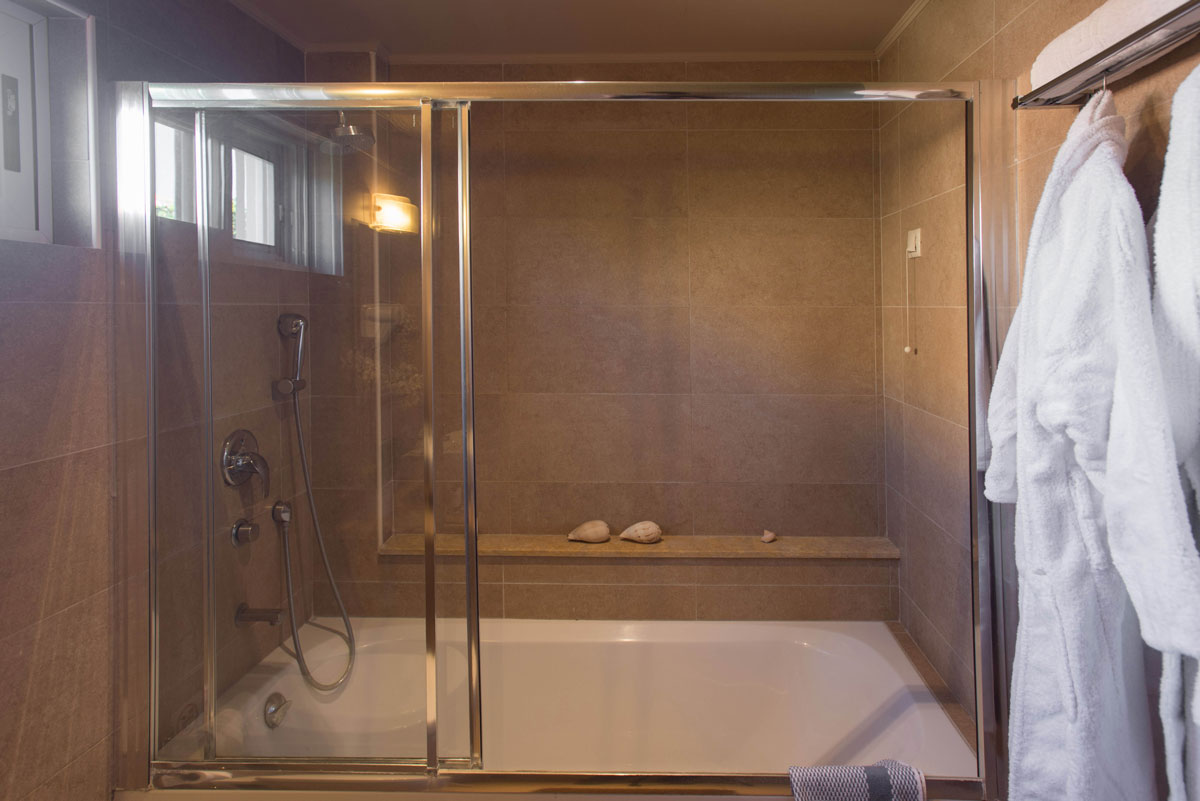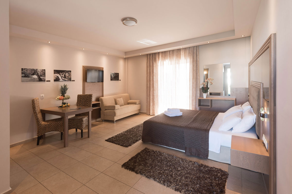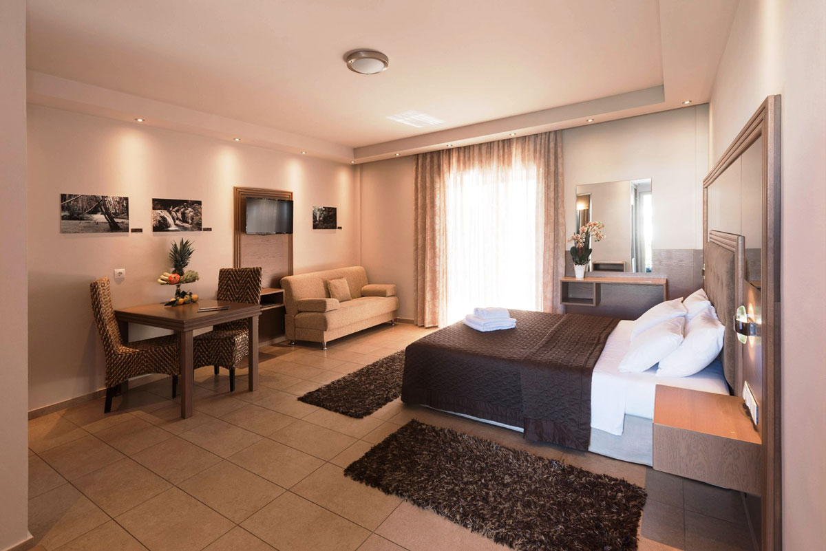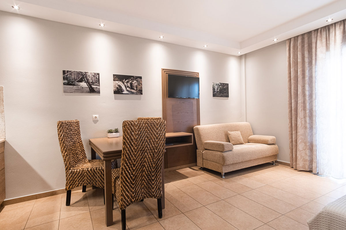 Eine luxuriöse Open Space Suite mit stilvollem Design und Layout, einer voll ausgestatteten Küche, einem Bad mit Badewanne und einer privaten Veranda.